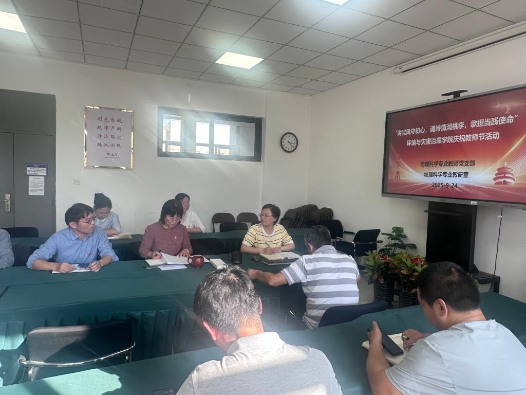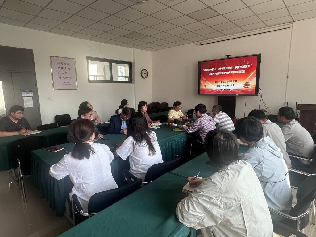 2025年9月24日下午,地理科学专业员工党支部在qy球友会320会议室举行以“以教育家精神铸魂强师,谱写教育强国建设华章”为主题的庆祝第41个员工节主题党日活动。qy球友会副院长刘小阳同志、党总支书记贾甚杰同志、支部全体党员以及教研室非党员员工参加。活动由党支部书记、教研室主任石云同志主持。